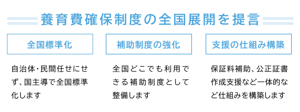 • 養育費確保の仕組みを普及・制度化し、ひとり親家庭の生活基盤を構築