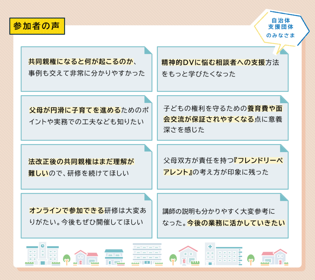 制度改正を前に、自治体の現場からは「実務対応を深めたい」「継続的に学ぶ機会がほしい」との声があがり、共同親権・親子交流・法定養育費に対する高い関心が寄せられました。